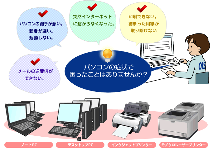 コンピュータ1台からプリンタ単体での修理も受付ています。